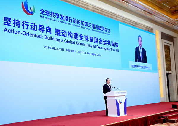 2026年4月22日,全球共享发展行动论坛第三届高级别会议在京举行。中共中央政治局委员、中央外办主任王毅出席开幕式并致辞