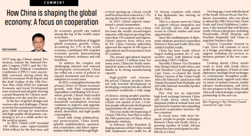 2026年4月20日,驻开普敦总领事任发强在南非主流媒体《开普时报》评论栏发表题为《中国:世界经济的“稳定锚” 开放合作的“新引擎”》的署名文章。全文如下: