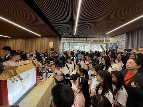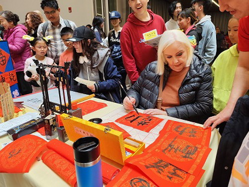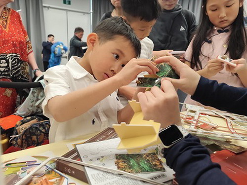演出结束后,观众们纷纷参与到沉浸式的文化体验活动中。中国总领馆的摊位前挤满了参与有奖答题活动的孩子,不少大人和孩子伴随着鼓点亲身体验舞狮的乐趣,现场充满欢声笑语。中文学校学生用自制道具表演的皮影戏吸引了众多观众围观。活字印刷、"福"字拓染、书法、剪纸、折纸、中国传统建筑立体拼图、诗词贴画创作、十二生肖填色游戏、掷年兽游戏、传统服装试穿等十余个体验项目让当地民众在互动中了解中文和中国文化的魅力。