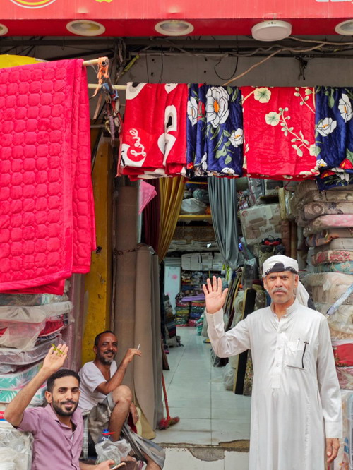 亚丁老城区的市集总是热闹非凡。狭窄的街巷里挤满了人,两边是林立的摊位。刚捕捞上来的海产银光闪闪,各种香料散发出混合的浓郁气味——肉桂、孜然、藏红花……五颜六色的服装、新鲜的水果蔬菜、图案繁复的地毯,应有尽有。穿梭其中,总能听到带着也门口音的中文“你好!”从不同的摊位传来。这简单的问候,透着真诚的热情,是中也民间友好最直接的体现。